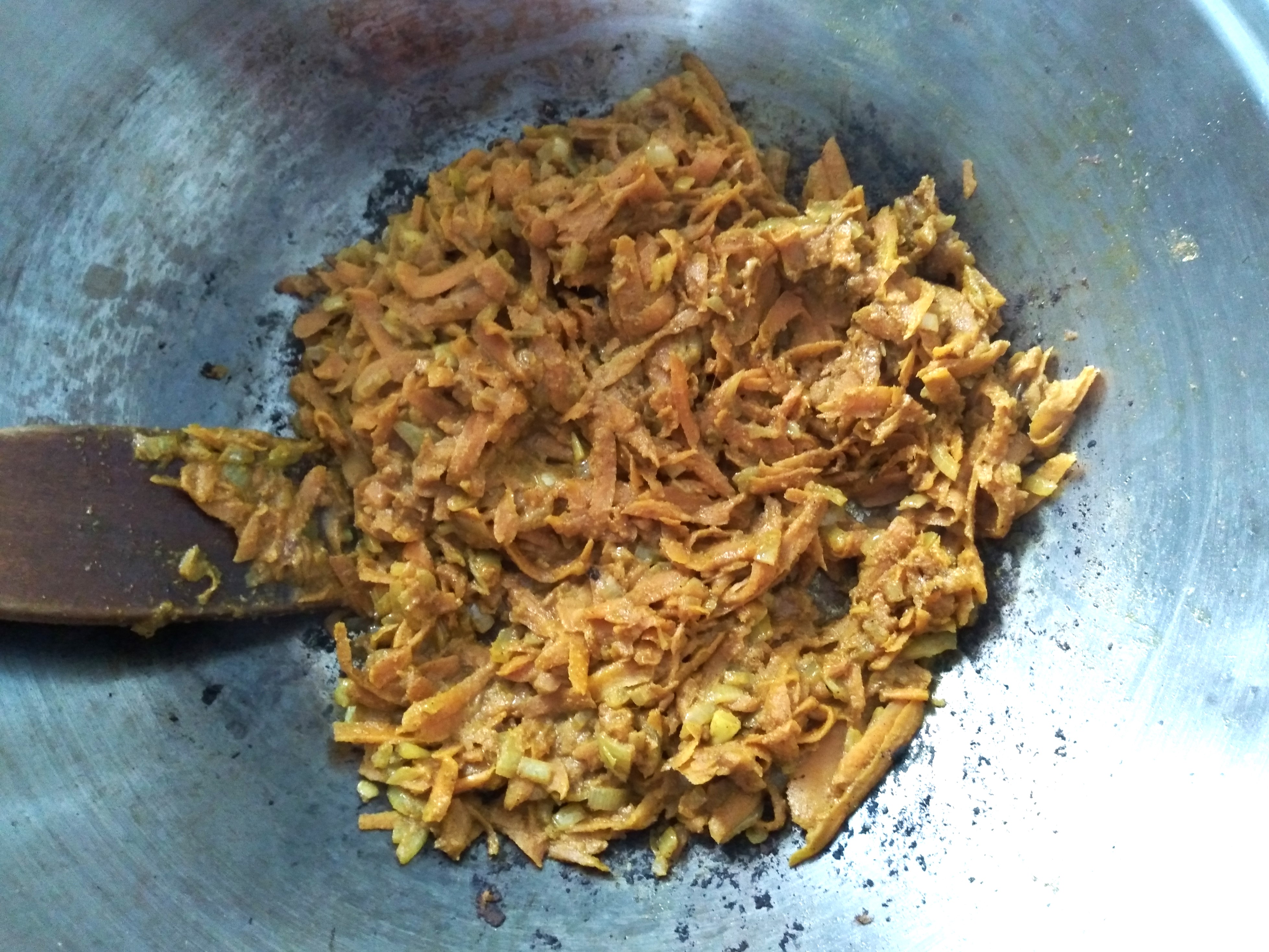 1. Heat the oil in a large pan over a medium to high heat until hot, and then fry together the diced onion, garlic powder, ginger, turmeric, cumin, cinnamon, coriander seeds, cardamon and grated carrots, stirring as needed to prevent burning.