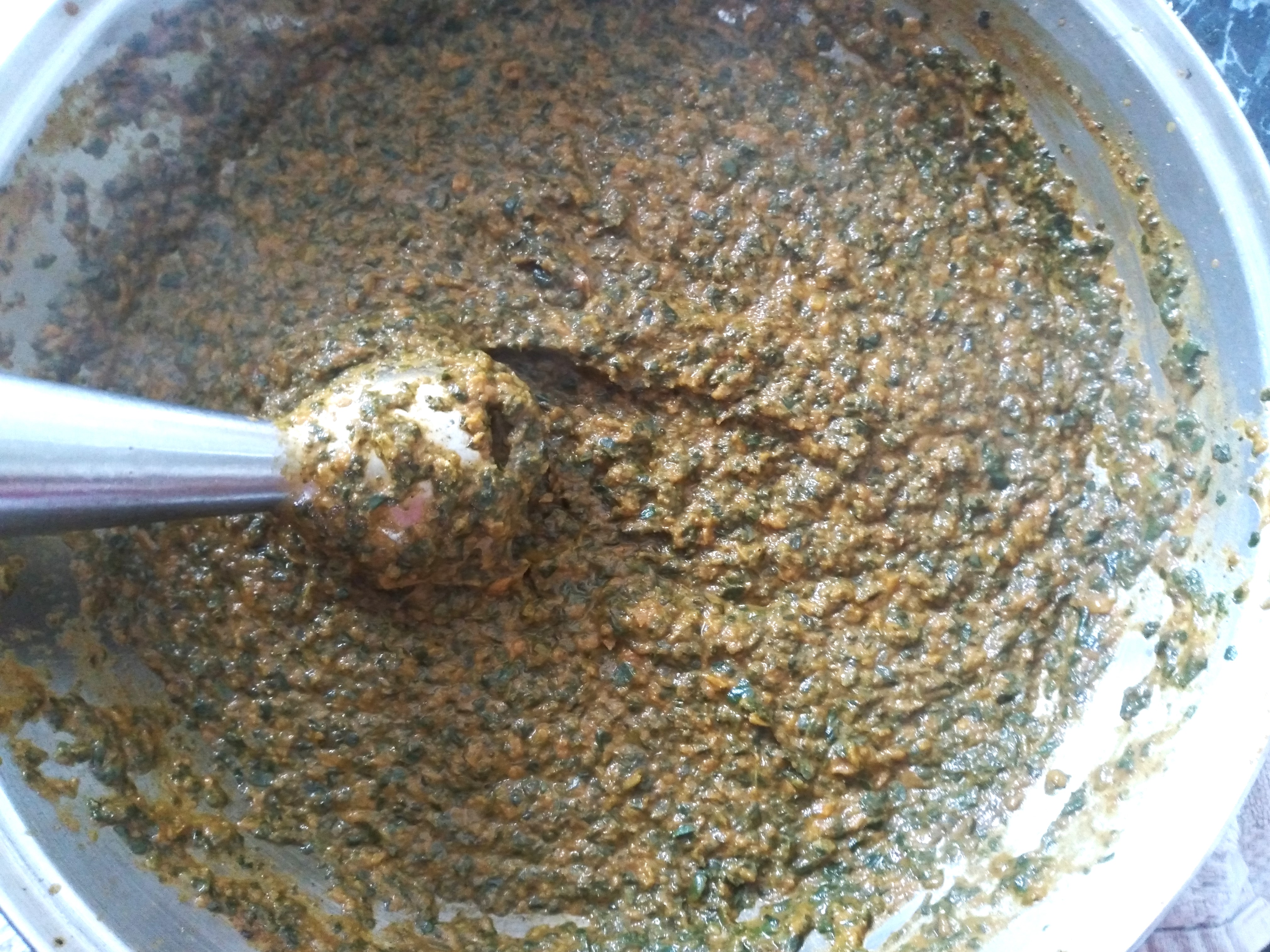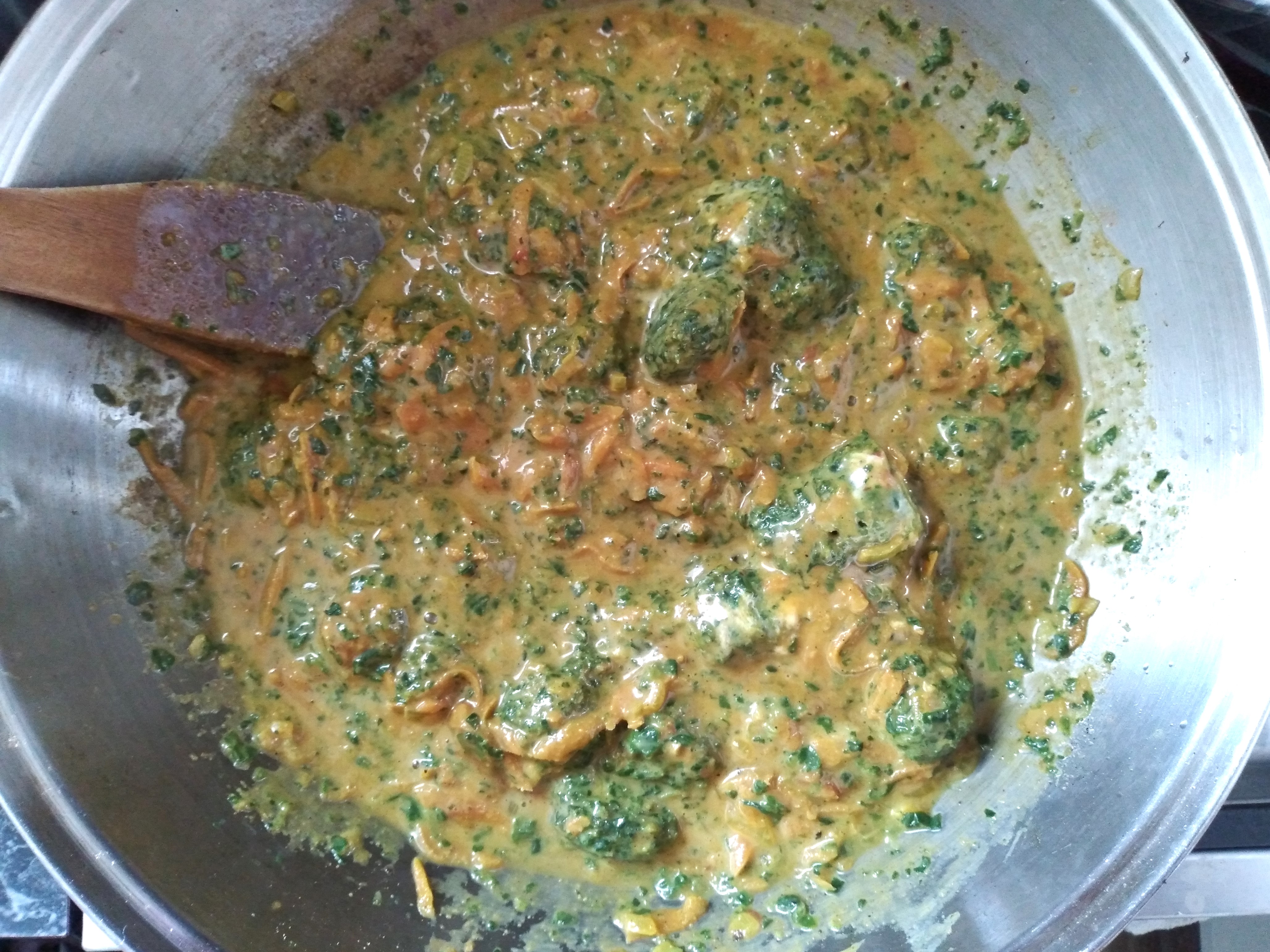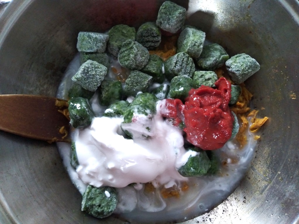 2. Add the frozen spinach, tomato paste and coconut milk to the pan and heat, stirring as needed to prevent burning, until the spinach has defrosted and everything in the pan is hot and well mixed. Blitz the ingredients in the pan with a stick blender to make a thick sauce (the blitzing is optional but I prefer the texture).