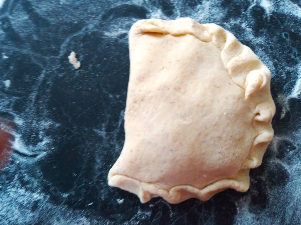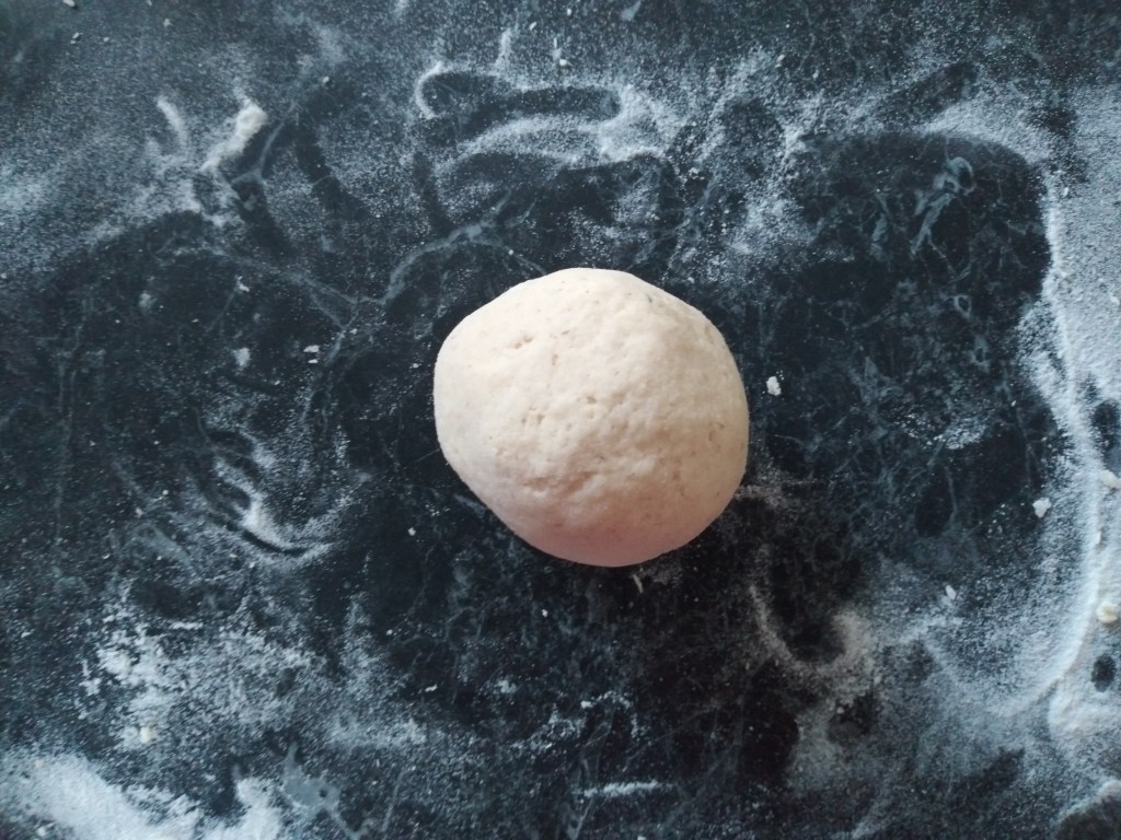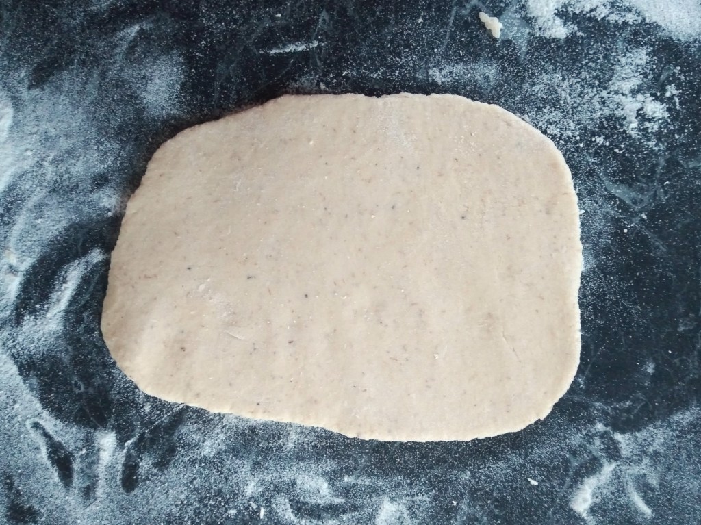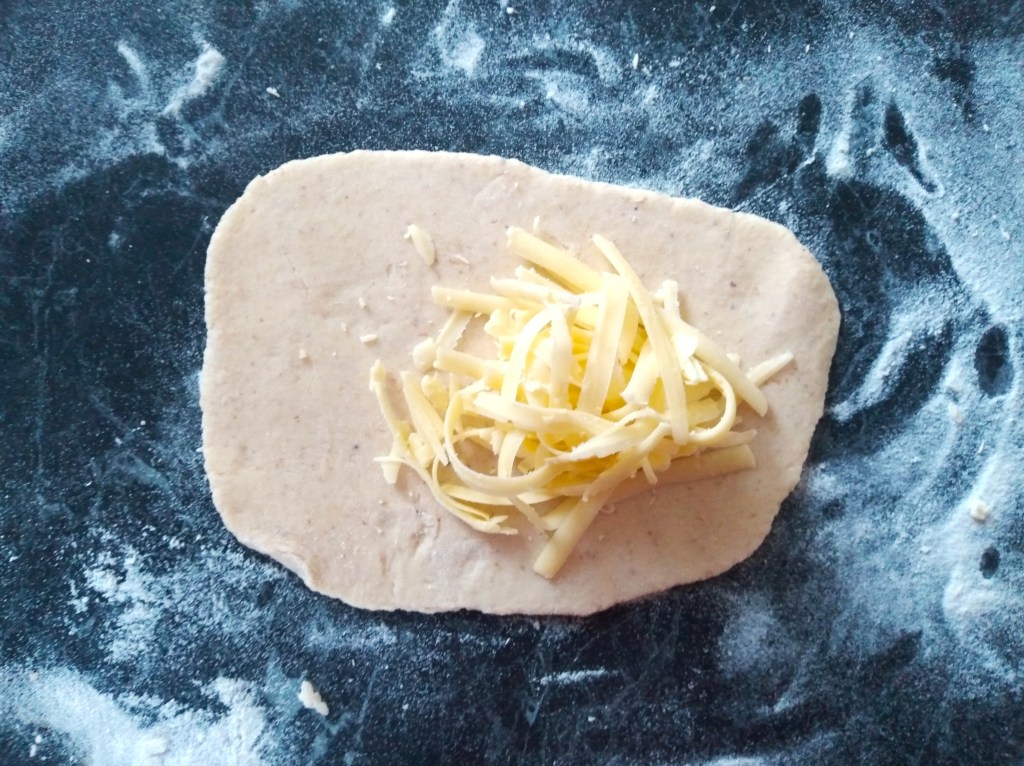 4. Shape and fill each of the 8 pieces of dough with cheese. If you have a preferred way to do this, feel free to use that. This is my method. First, roll each piece of dough into an oval or rectangular shape that is about a half centimetre thick. Place a generous handful of grated cheese into one half of the oval, leaving a margin about 1 to 1 ½ centimetres from the edge with no cheese. Fold the oval in half, placing the half without any cheese over the half with cheese and then crimp the edge tightly to trap in the cheese. Flip the half-oval over and gently shape into a ball and then flatten the ball into a circle with your hands. If cheese starts to escape from the ball or cracks appear, I tend to patch them with bits of dough from the edge of the circle or to flip the circle again, reshape it into a ball and then flatten it again. Continue doing this until you have 8 circles of cheese-filled dough not-naans.