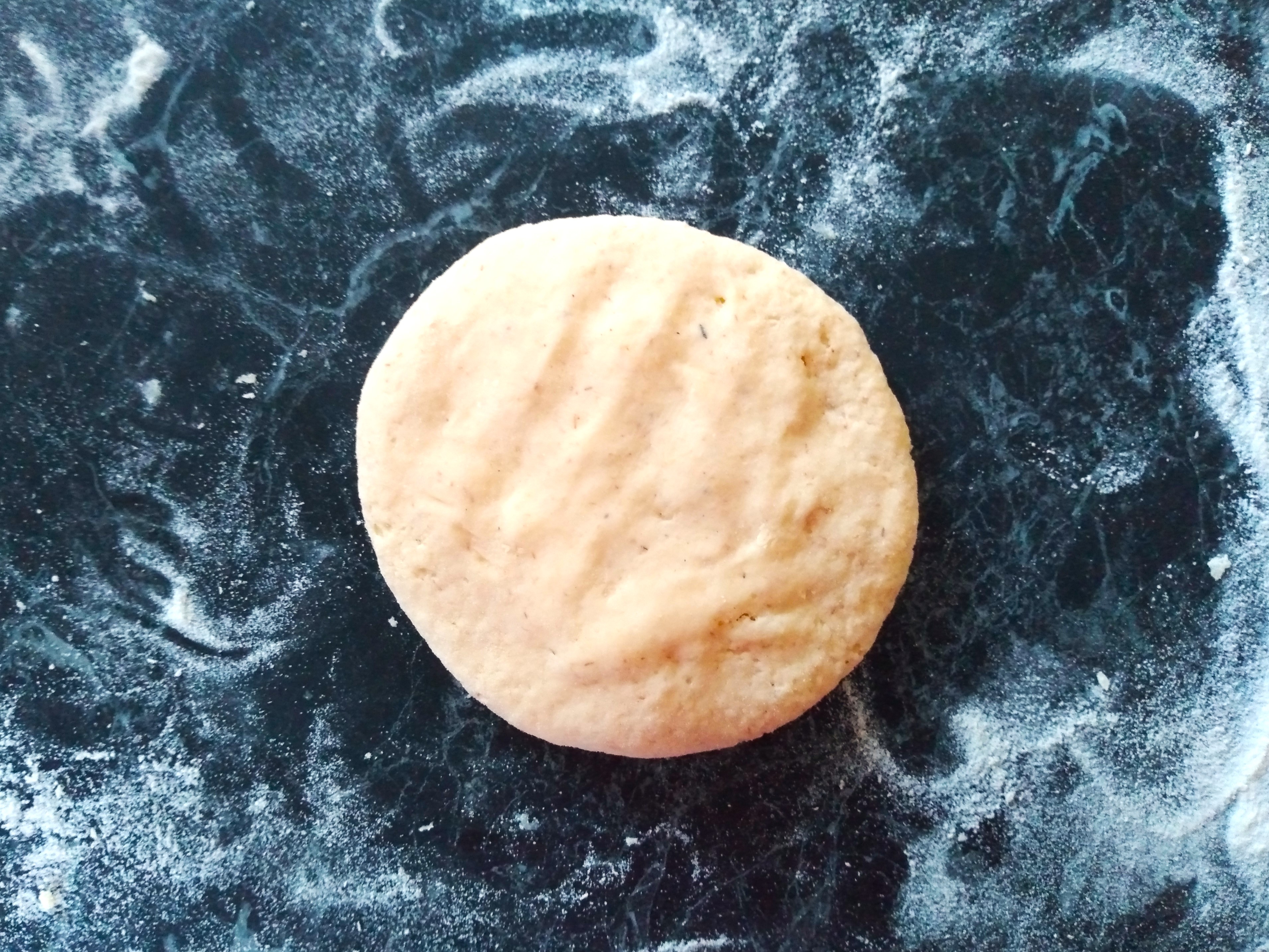 4. Shape and fill each of the 8 pieces of dough with cheese. If you have a preferred way to do this, feel free to use that. This is my method. First, roll each piece of dough into an oval or rectangular shape that is about a half centimetre thick. Place a generous handful of grated cheese into one half of the oval, leaving a margin about 1 to 1 ½ centimetres from the edge with no cheese. Fold the oval in half, placing the half without any cheese over the half with cheese and then crimp the edge tightly to trap in the cheese. Flip the half-oval over and gently shape into a ball and then flatten the ball into a circle with your hands. If cheese starts to escape from the ball or cracks appear, I tend to patch them with bits of dough from the edge of the circle or to flip the circle again, reshape it into a ball and then flatten it again. Continue doing this until you have 8 circles of cheese-filled dough not-naans.