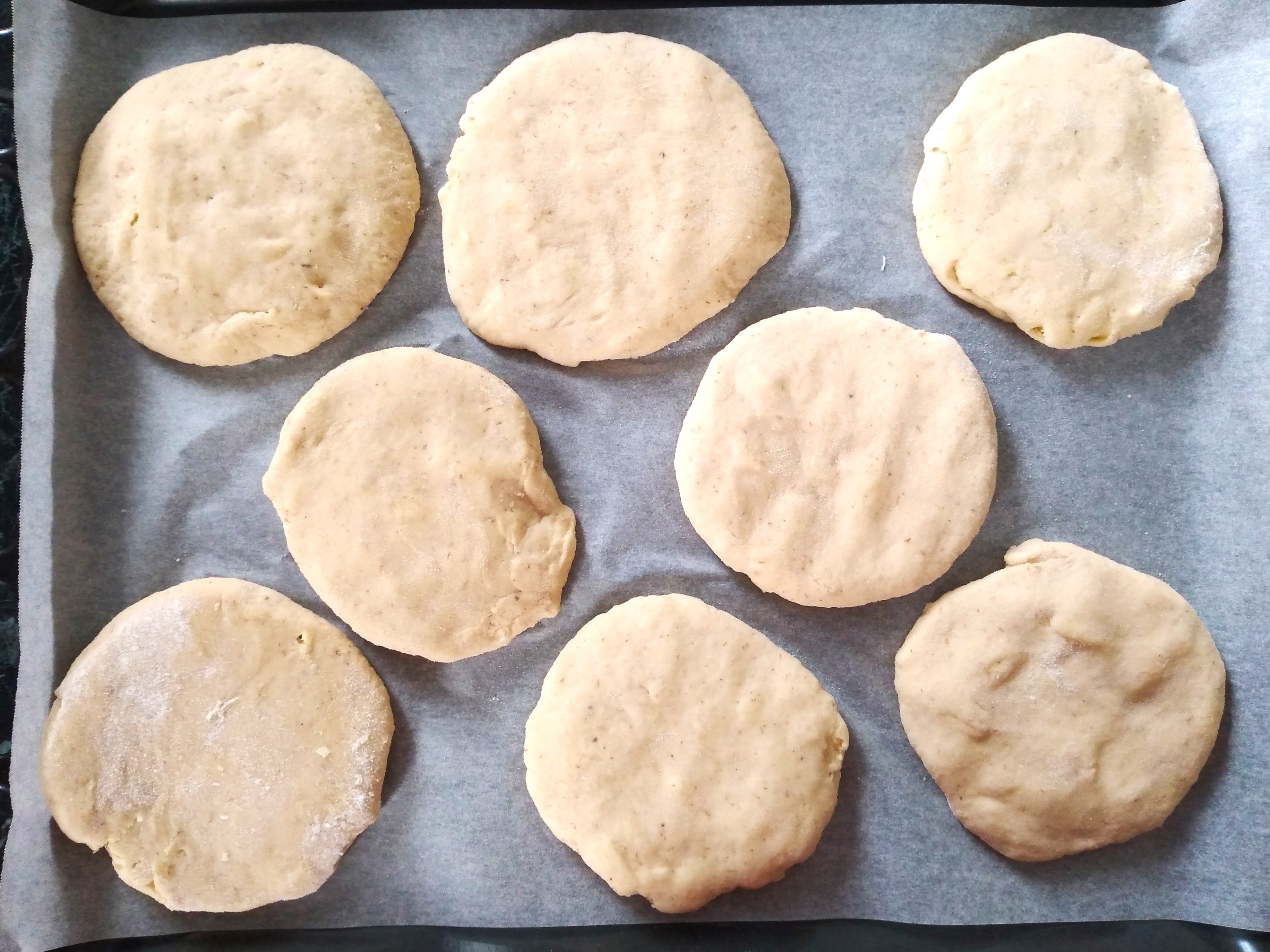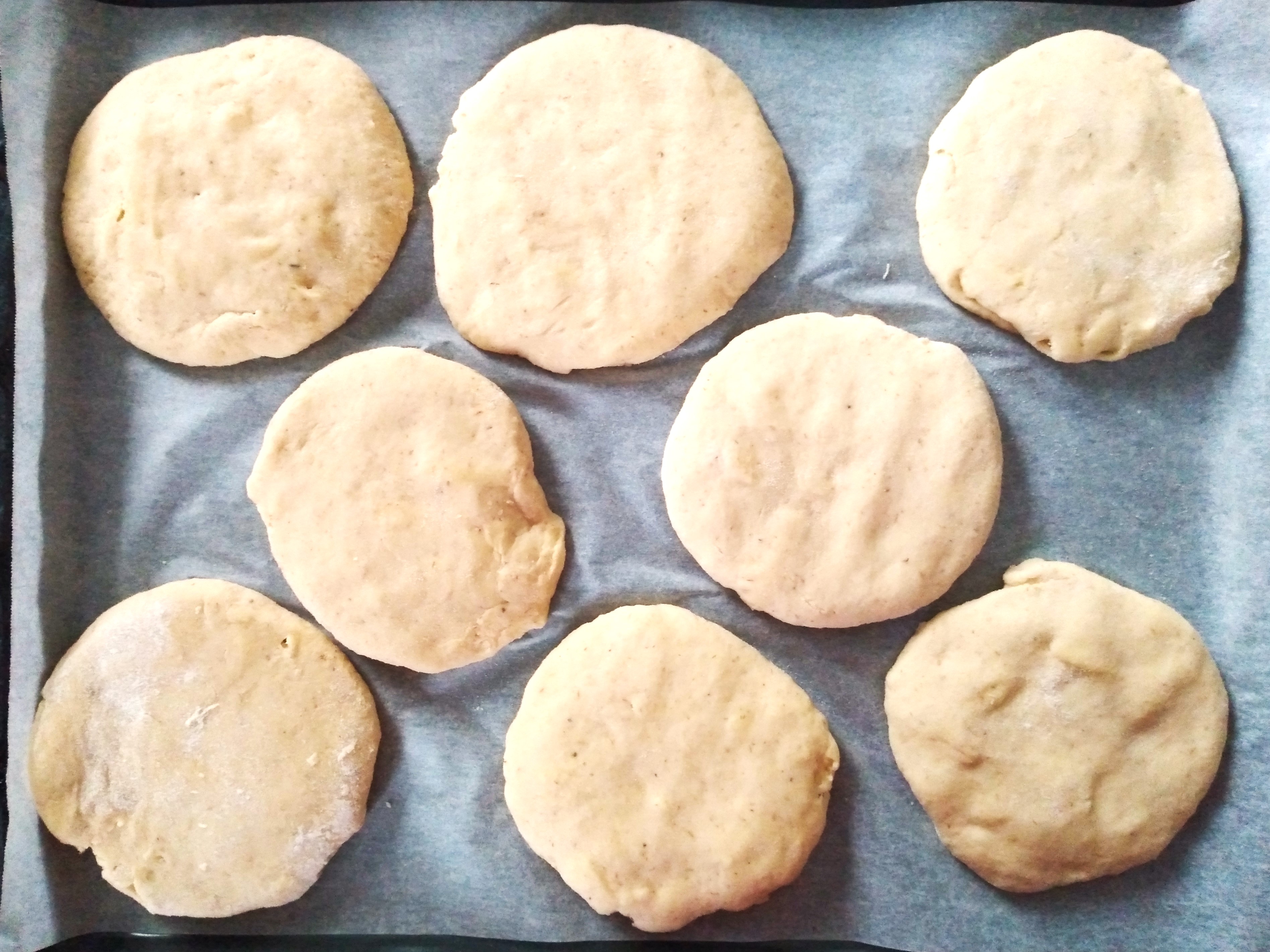 5. Place the dough circles onto a baking tray lined with baking paper, cover them (I usually use a piece of clingfilm beneath a clean cloth or a damp clean cloth) and leave somewhere warm to rise until about one and a half times their original size.