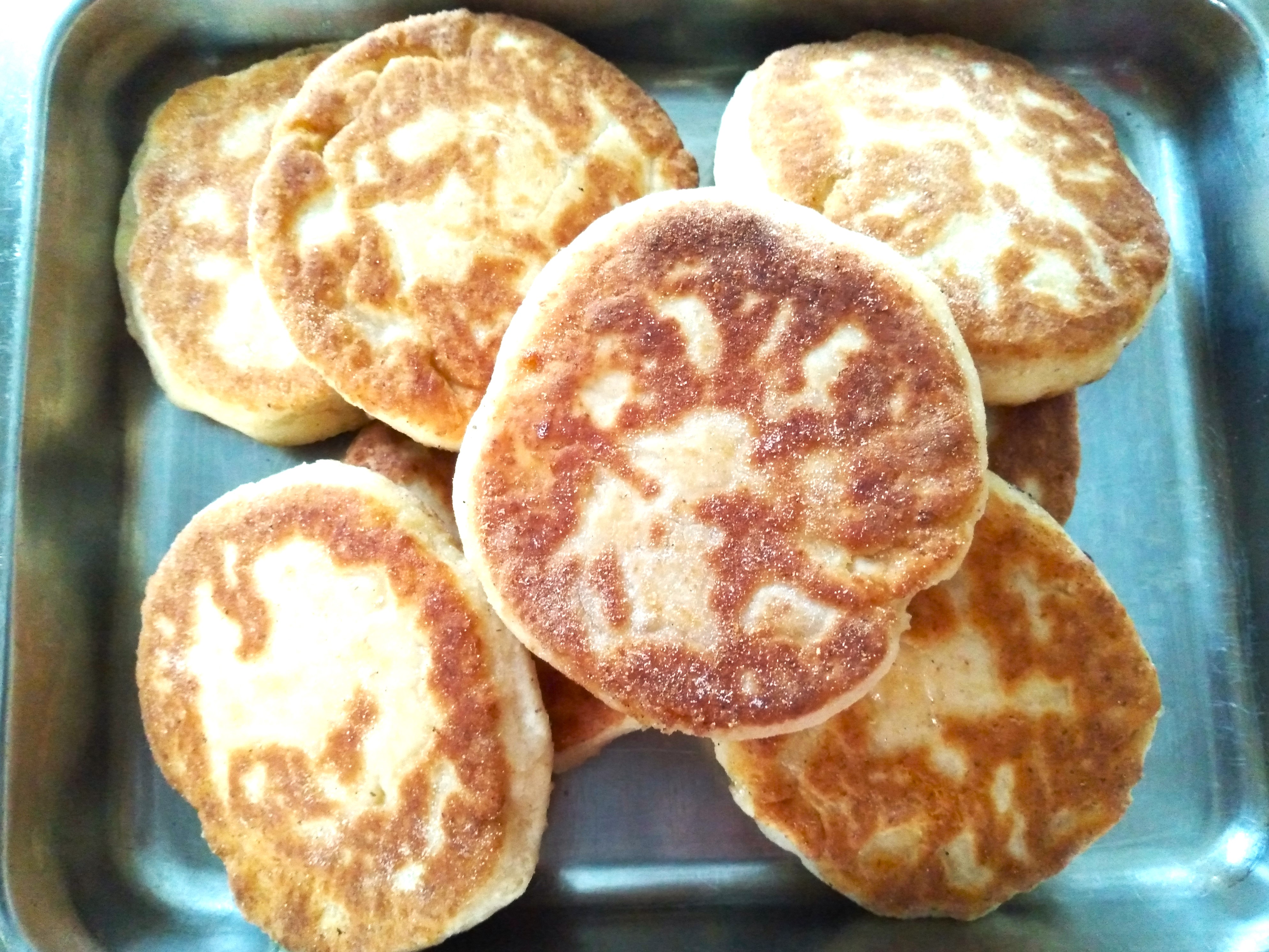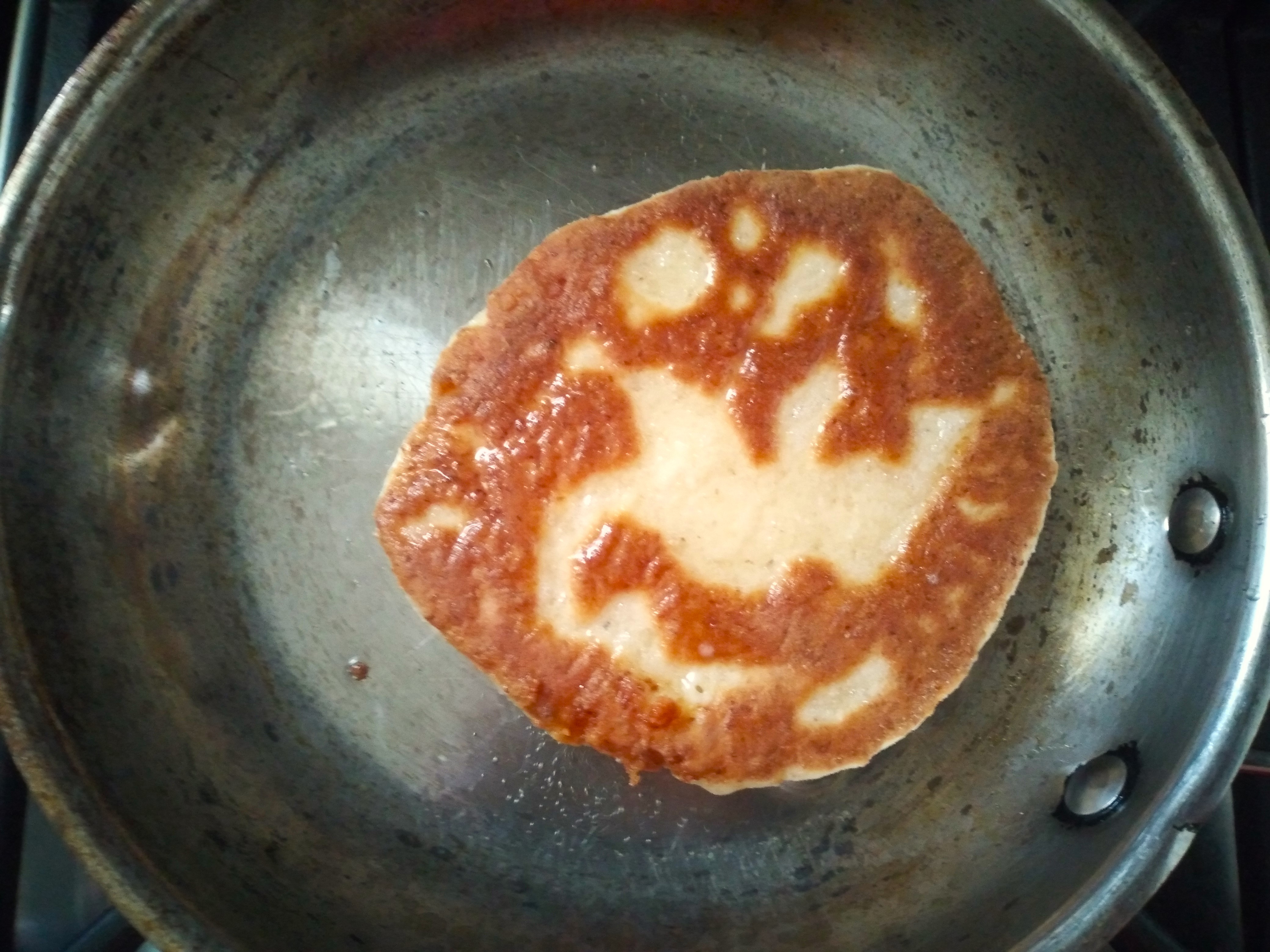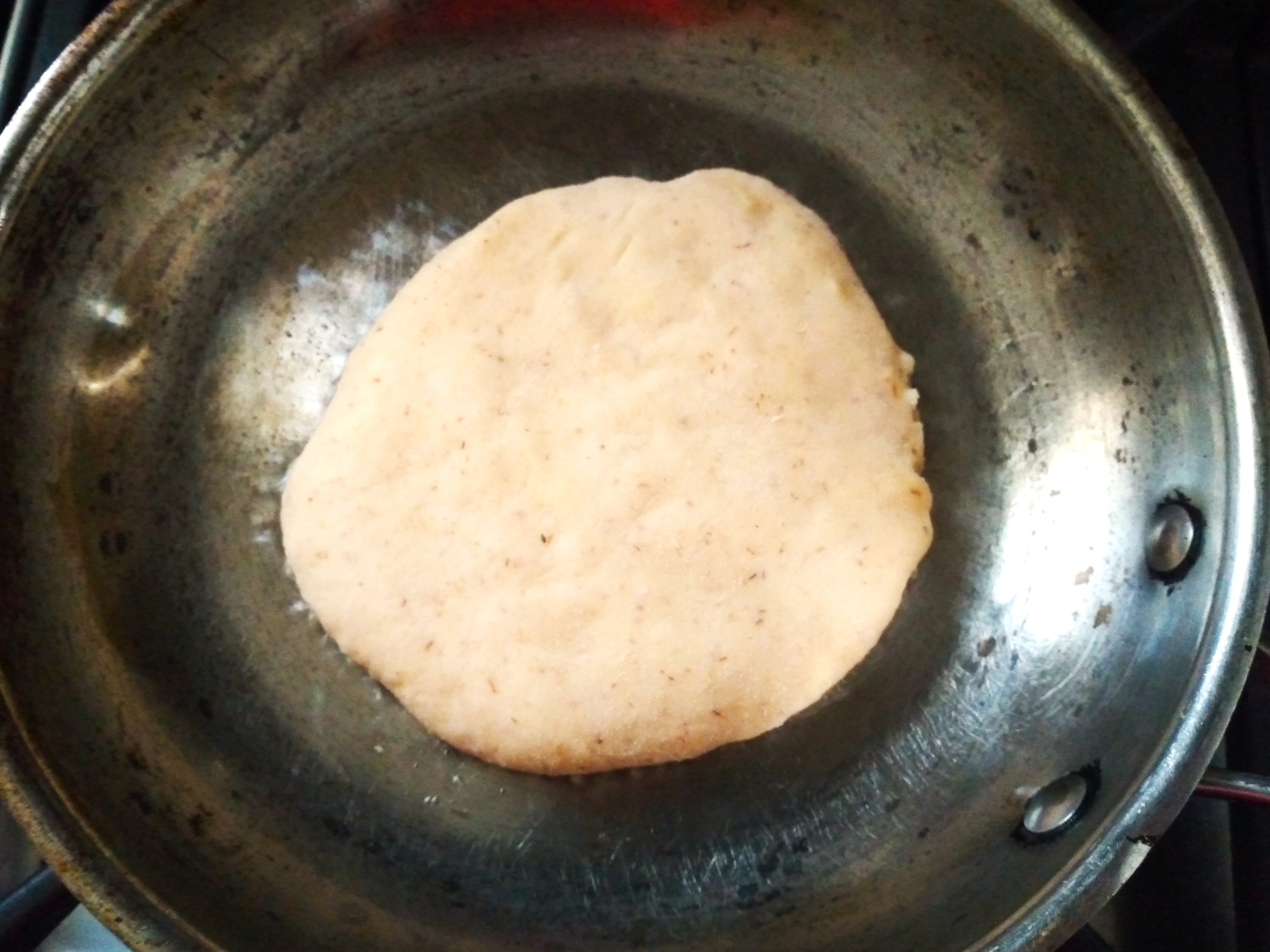 6. Once the dough has risen, heat a small amount of oil in a frying pan until hot and then shallow fry each of the dough circles, turning over once the first side is cooked and golden brown. Try not to let the oil get too hot so there is time for the middle to cook before the outside starts burning. I only have a small frying pan, so do one at a time, but you can do multiple not-naans at once if you have a bigger pan. Keep the cooked ones warm in a low oven while you finish cooking the rest and then serve warm.
