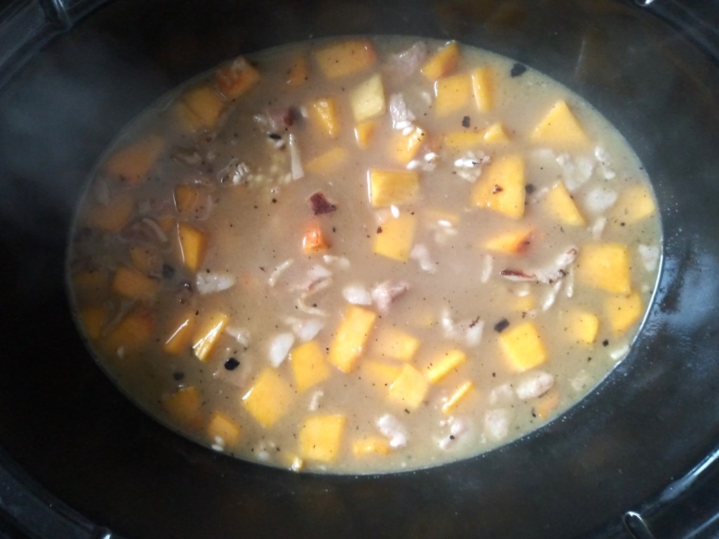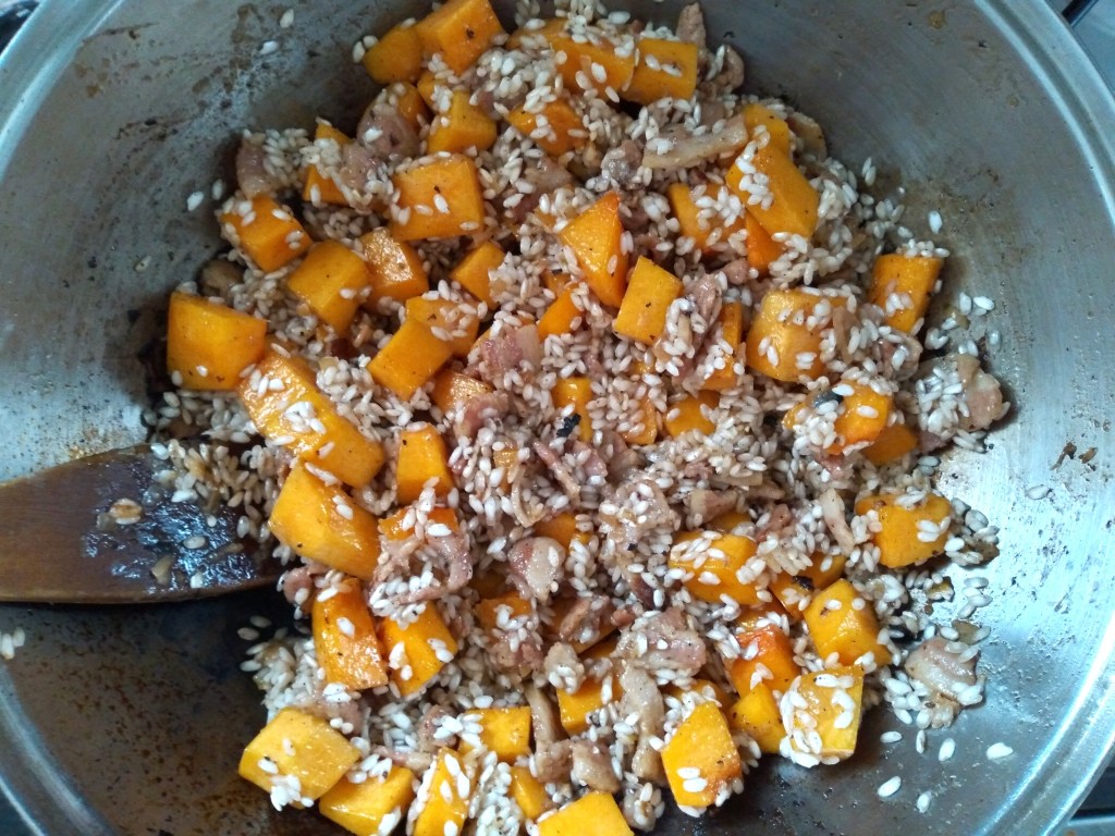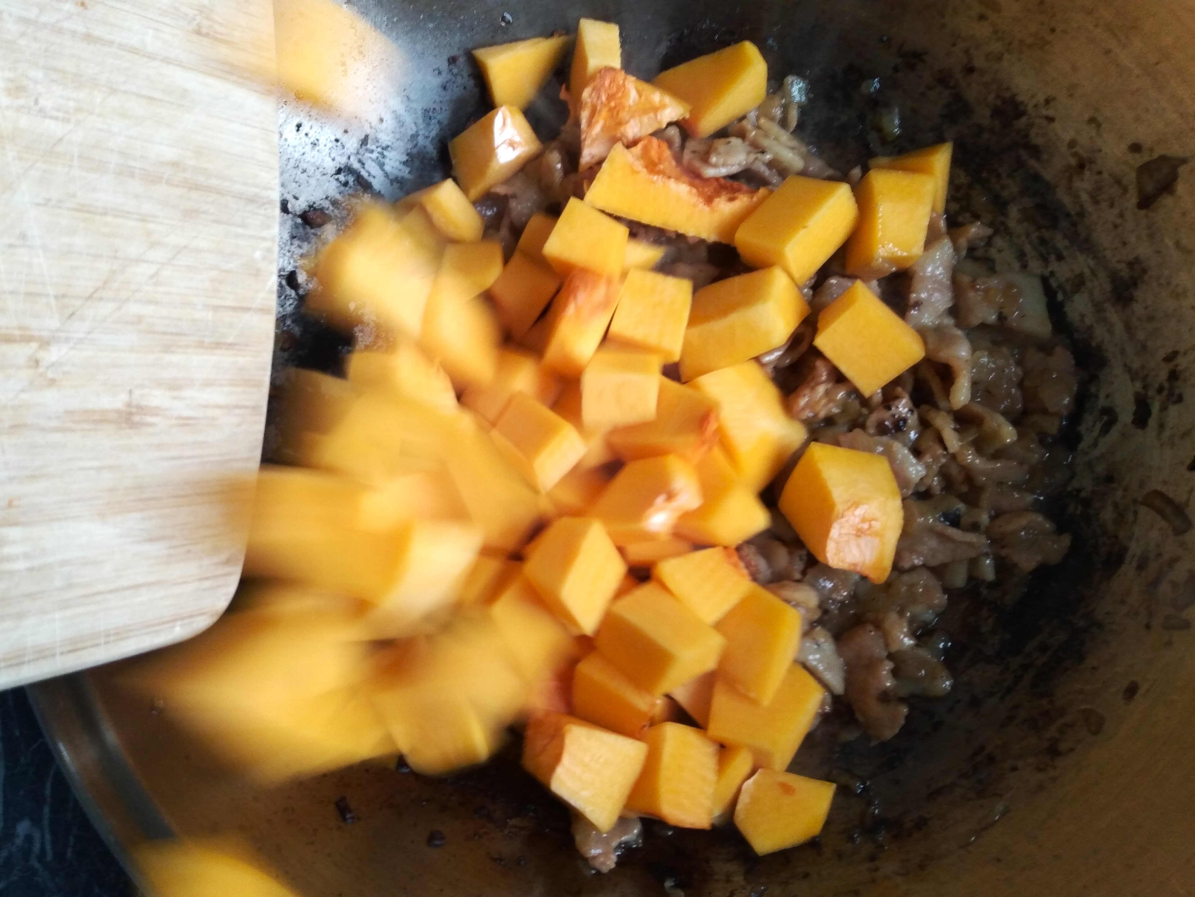 2. Once the onions and bacon are cooked, add the butternut and fry briefly, stirring constantly, to start caramelising the edges of each cube.