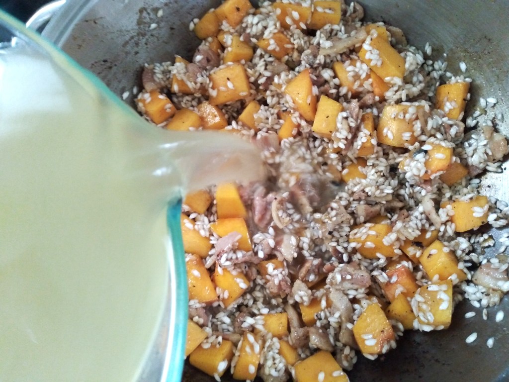 4. Add the hot stock to the pan and stir everything together (using hot stock will help to deglaze the pan).