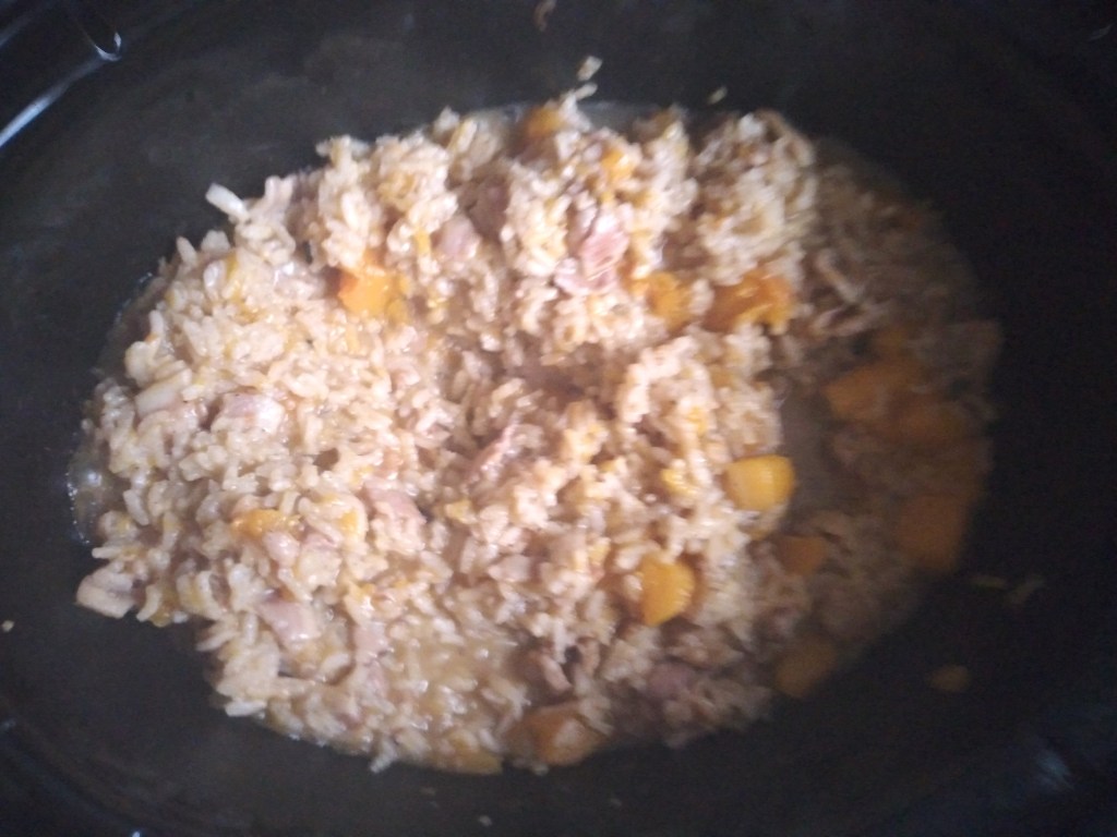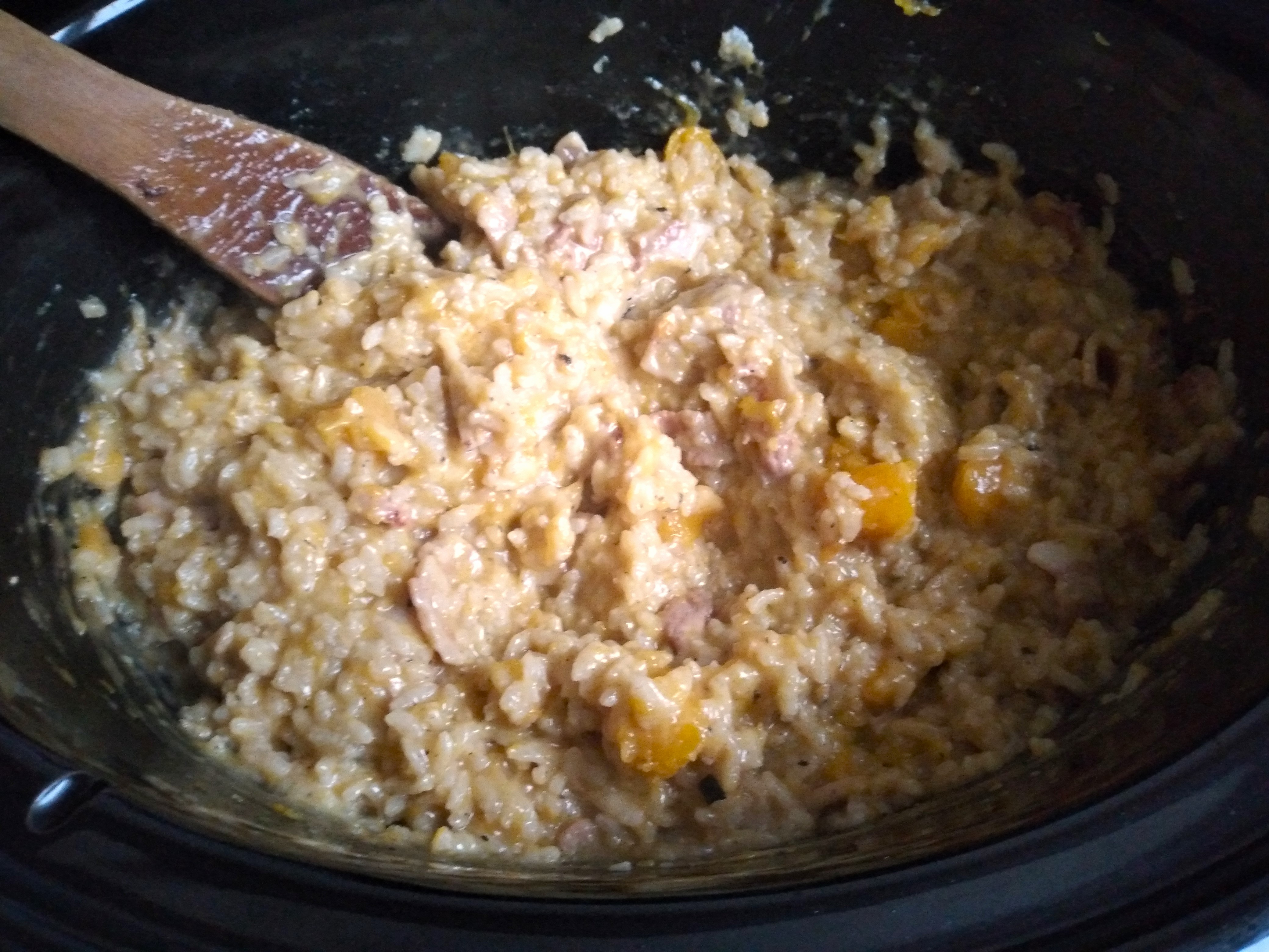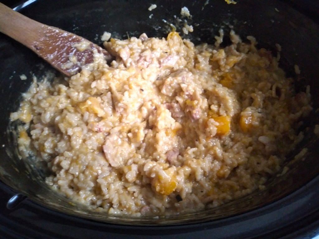 5. Tip the entire contents of the pan into the slow cooker. Place the lid on the slow cooker and turn it to ‘high’. Leave the risotto to cook in the slow cooker for about an hour, stirring a couple of times during that time to make sure no rice is sticking to the bottom.