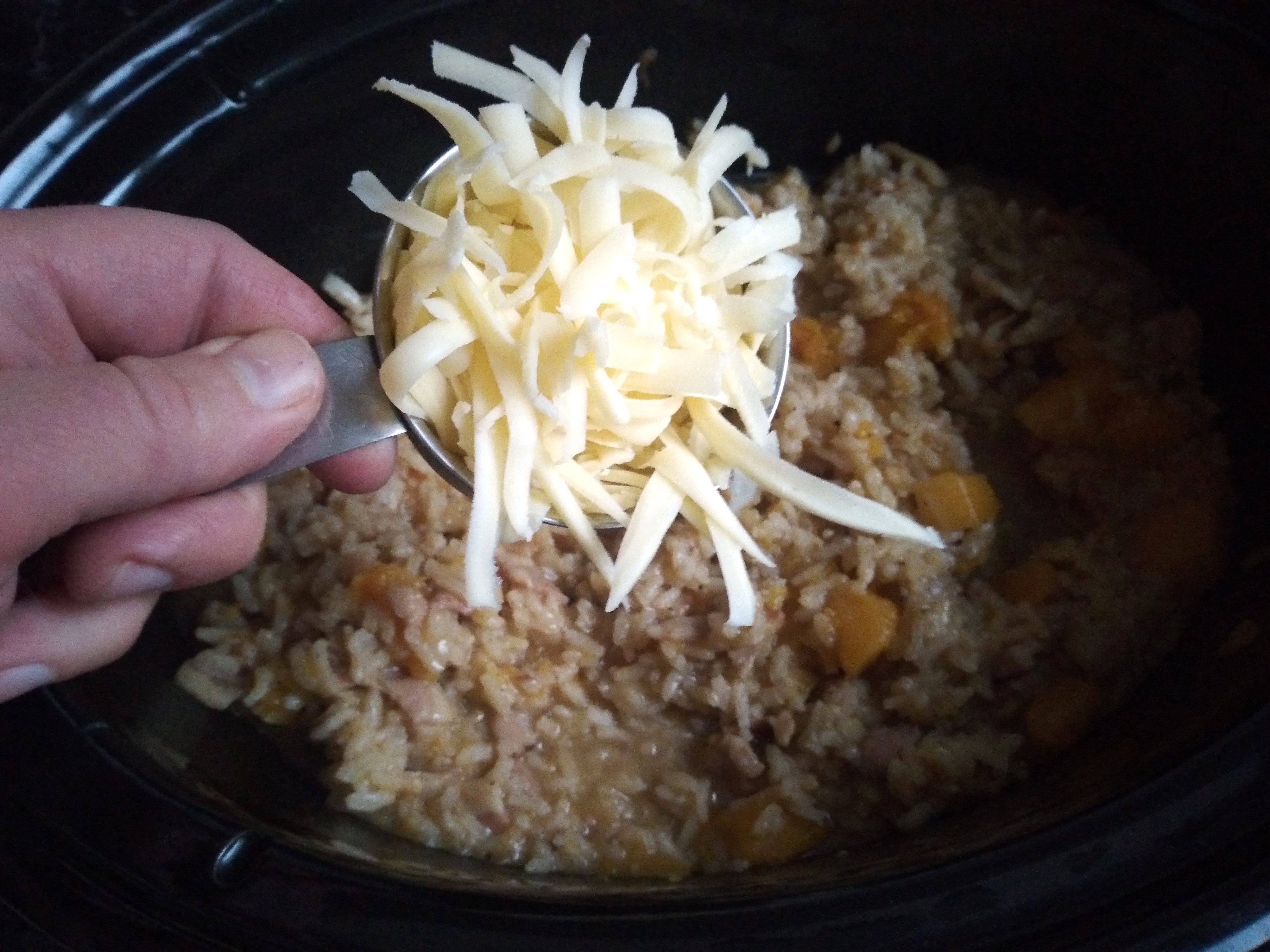 7. Once the risotto is cooked, stir the grated cheese thoroughly into the risotto. Stir salt and pepper to taste through the risotto and then turn off the slow cooker.