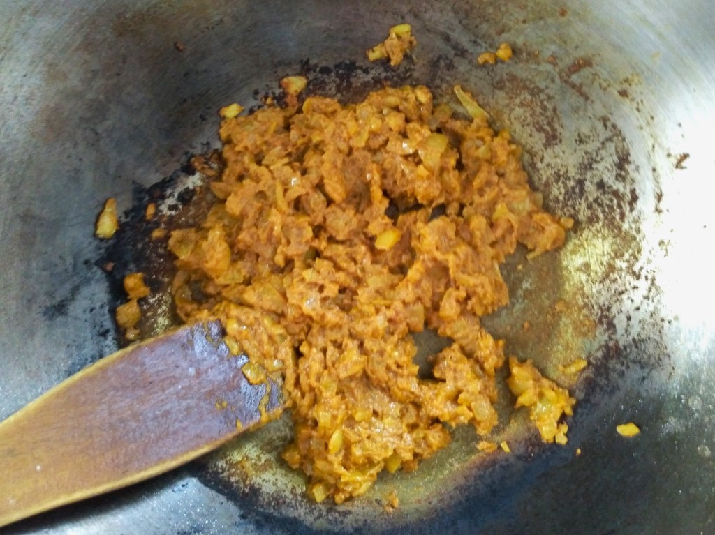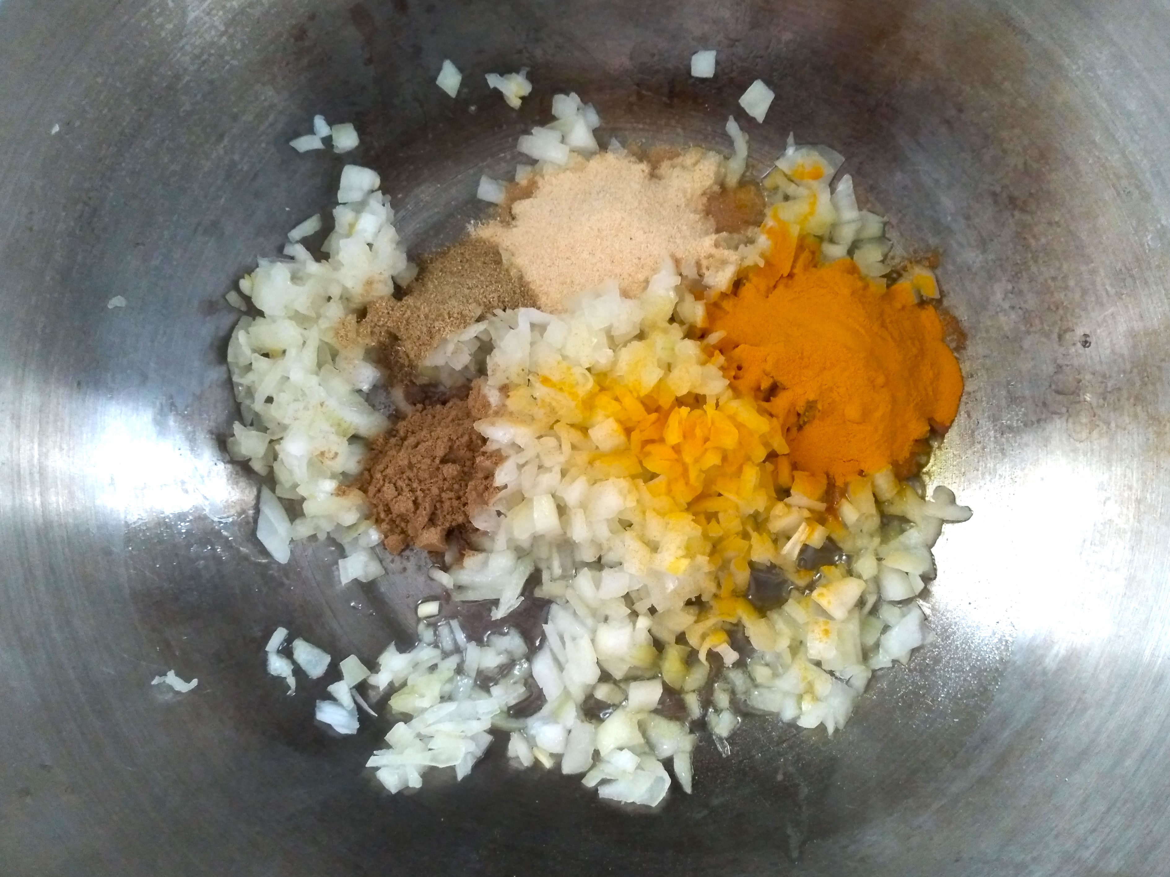 1. Heat the oil to very hot in a large frying pan. Add the diced onion, garlic powder, cumin, coriander and turmeric powder to the hot oil and fry until the onion is soft. If it starts to burn, add a little bit of water and keep cooking until the water has evaporated.