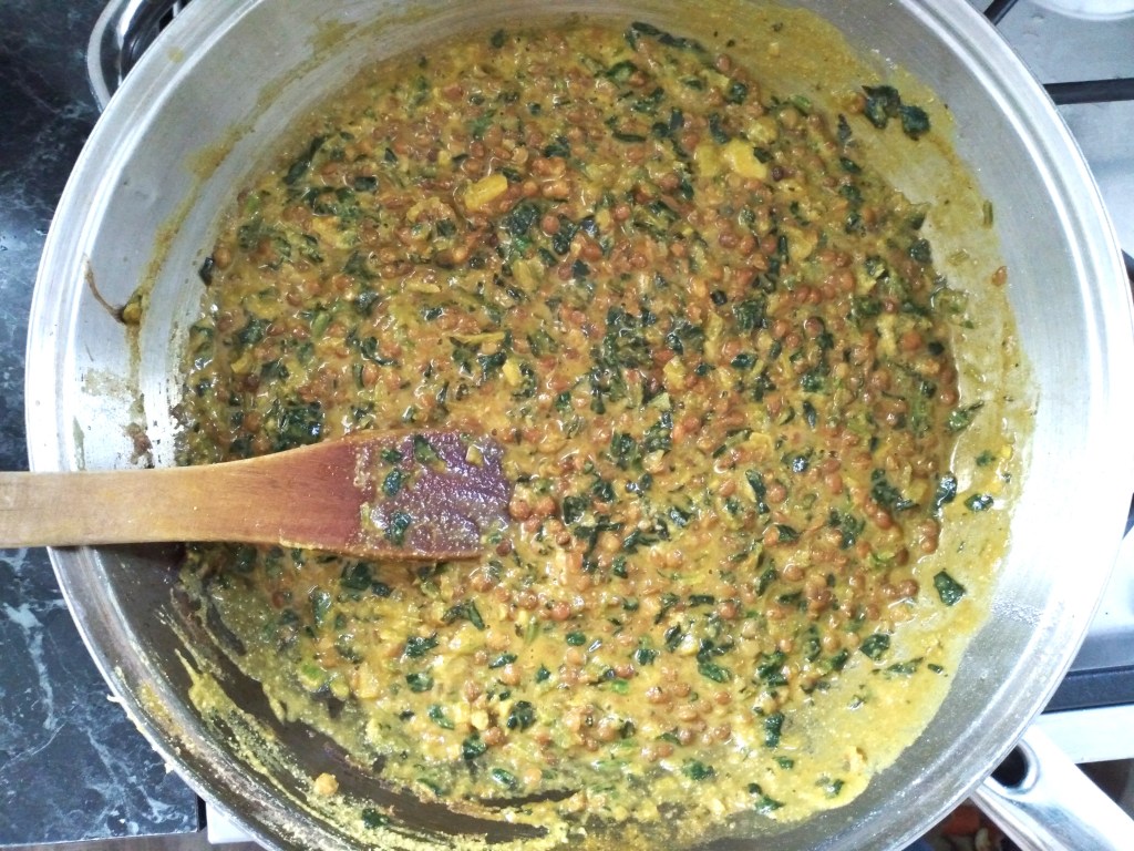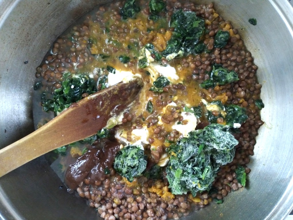 2. Add the lentils, frozen spinach, coconut milk and tamarind paste to the pan and cook, stirring frequently, until the spinach has defrosted fully and everything is fully combined.