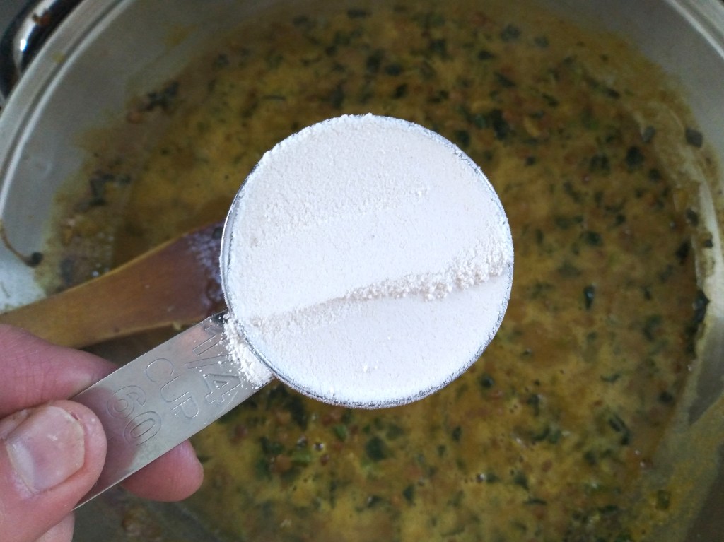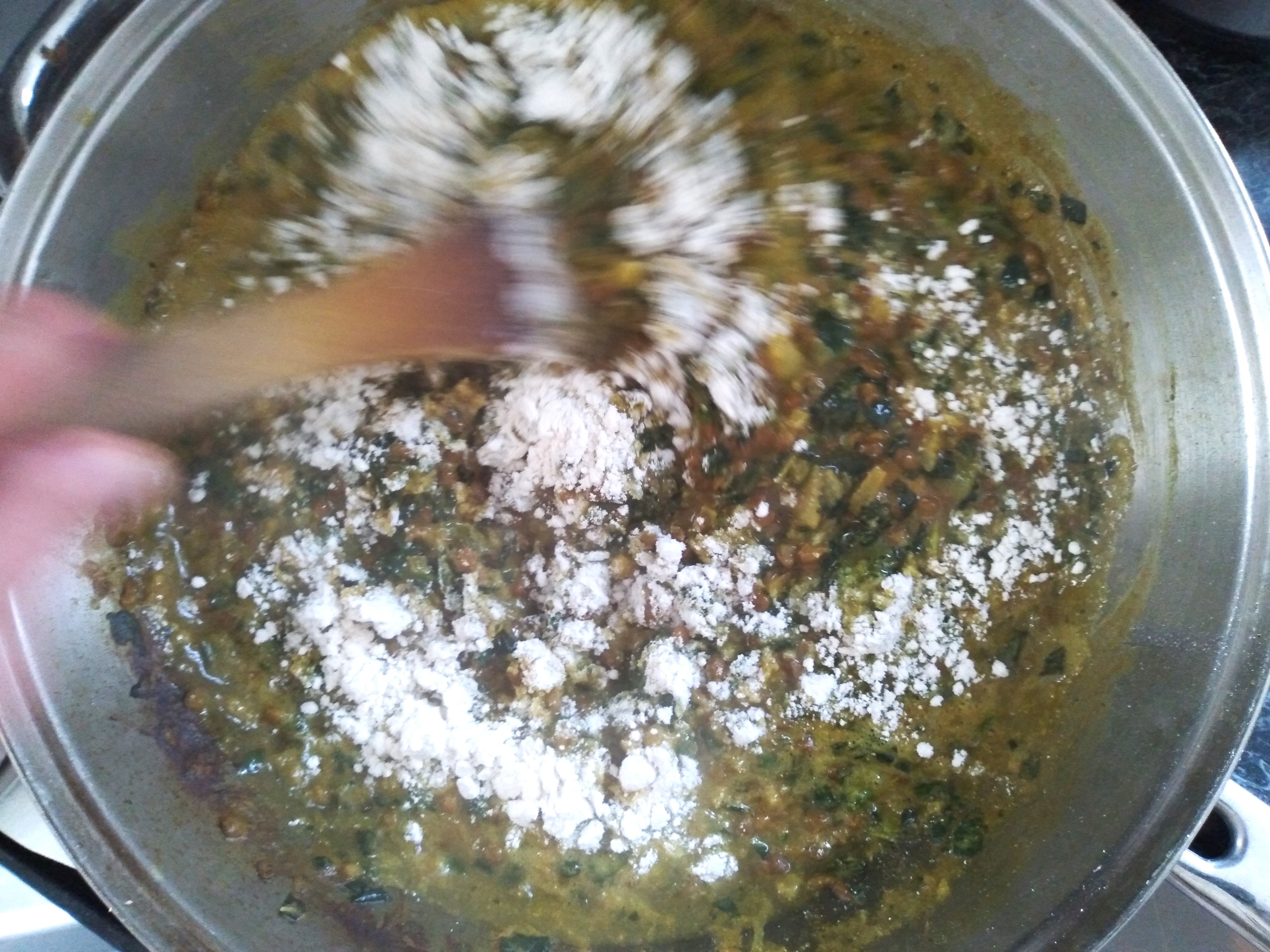 3. Add the coconut flour to the pan and stir well to mix in thoroughly, and then simmer the lentil mixture in the pan for about 5 minutes, or until it reaches a thick sauce consistency.