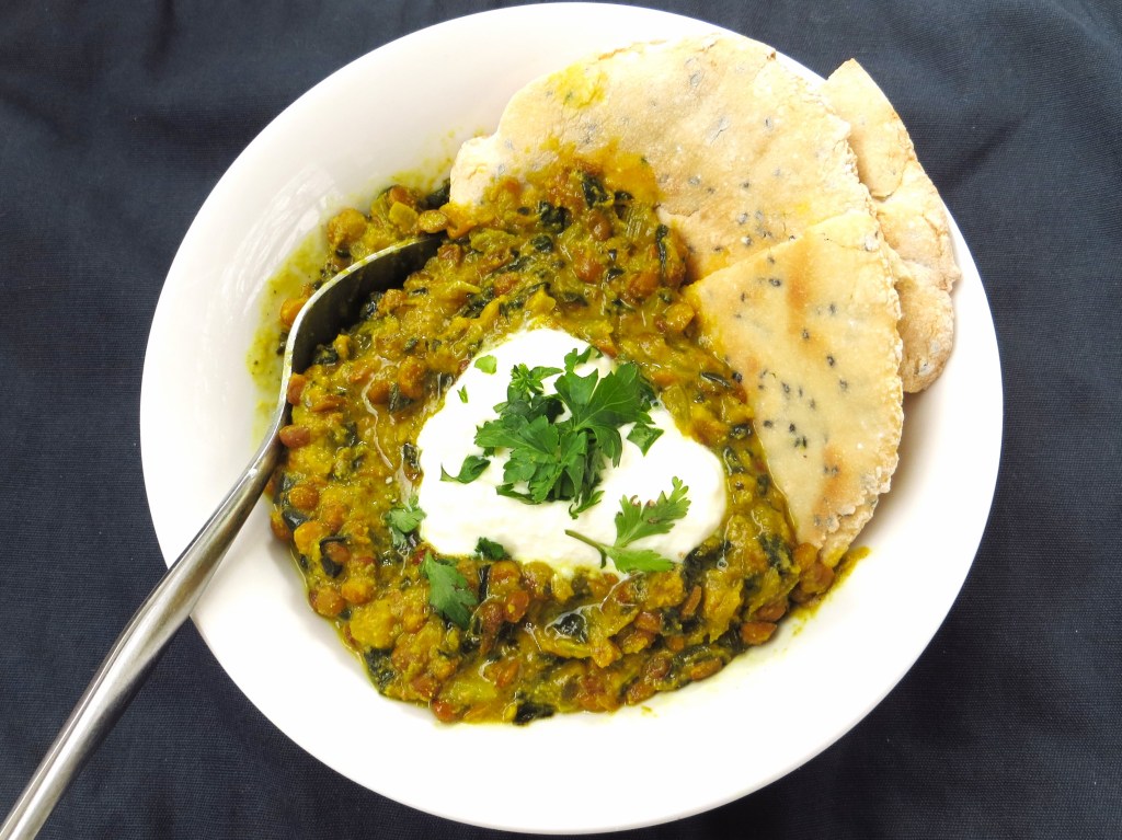 5. Remove the pan from the heat and divide the lentils between 4 bowls. Top each bowl with generous dollop of yogurt and sprinkling of chopped fresh coriander. Serve with the flatbreads. If you aren’t ready to eat these straight away, either store in the fridge for a couple of days or freeze for later use. Either way, you may need to add a bit of extra water when you reheat them to ensure the lentils are a good consistency.