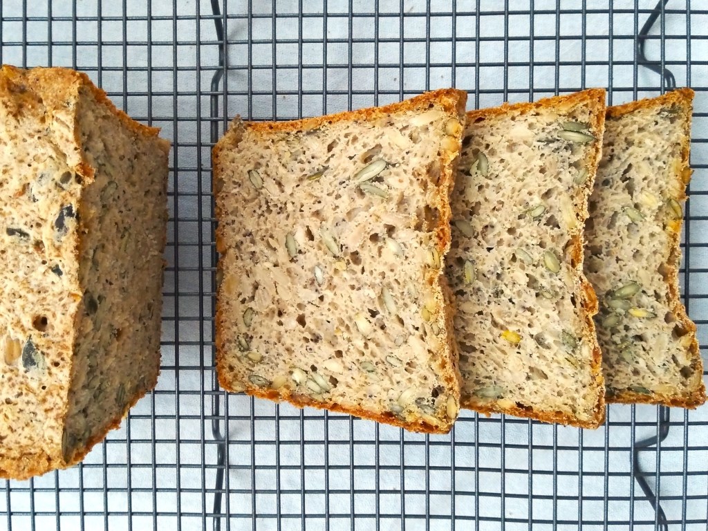 This bread is full of seedy goodness – I like to use a mix of a small quantity of small seeds, such as sesame seeds and poppy seeds, and a bigger quantity of big seeds, such as sunflower and pumpkin seeds, but feel free to experiment with whatever your preferences are (and let me know if you come up with an amazing combination!).