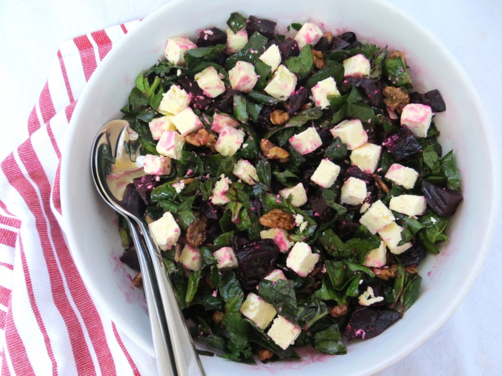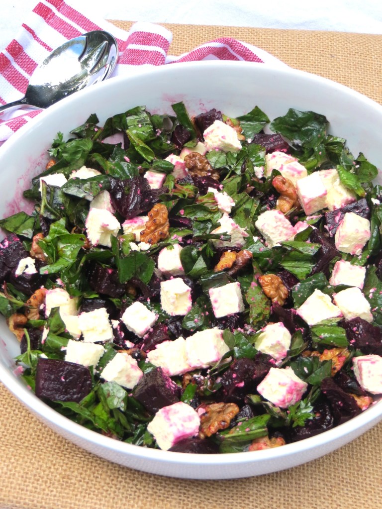 5. When you are ready to finish making the salad, place the baby spinach (or other salad leaves) in a salad bowl along with the cooked beetroot and roasted walnuts.