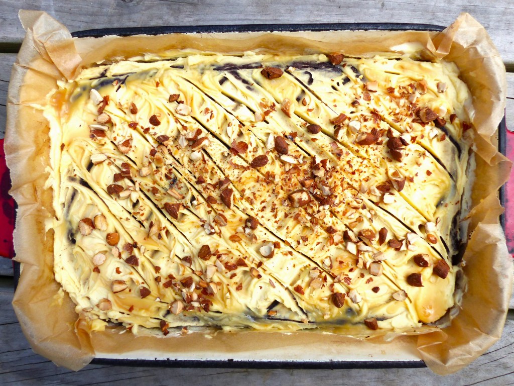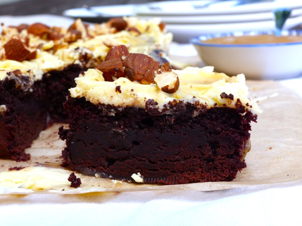 1. Once the brownie and salted caramel sauce have cooled fully, spread the mascarpone cream over the top of the brownie in an even layer.