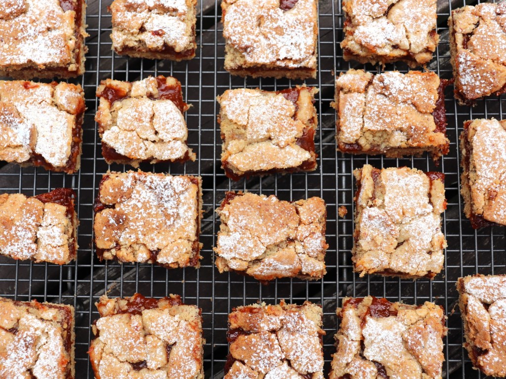 9. Place the slice in the pan on a cooling rack to cool. Once it is cool enough to handle, cut the slice into 20 equal-sized pieces and take each piece out of the pan and place on a cooling rack to cool completely.