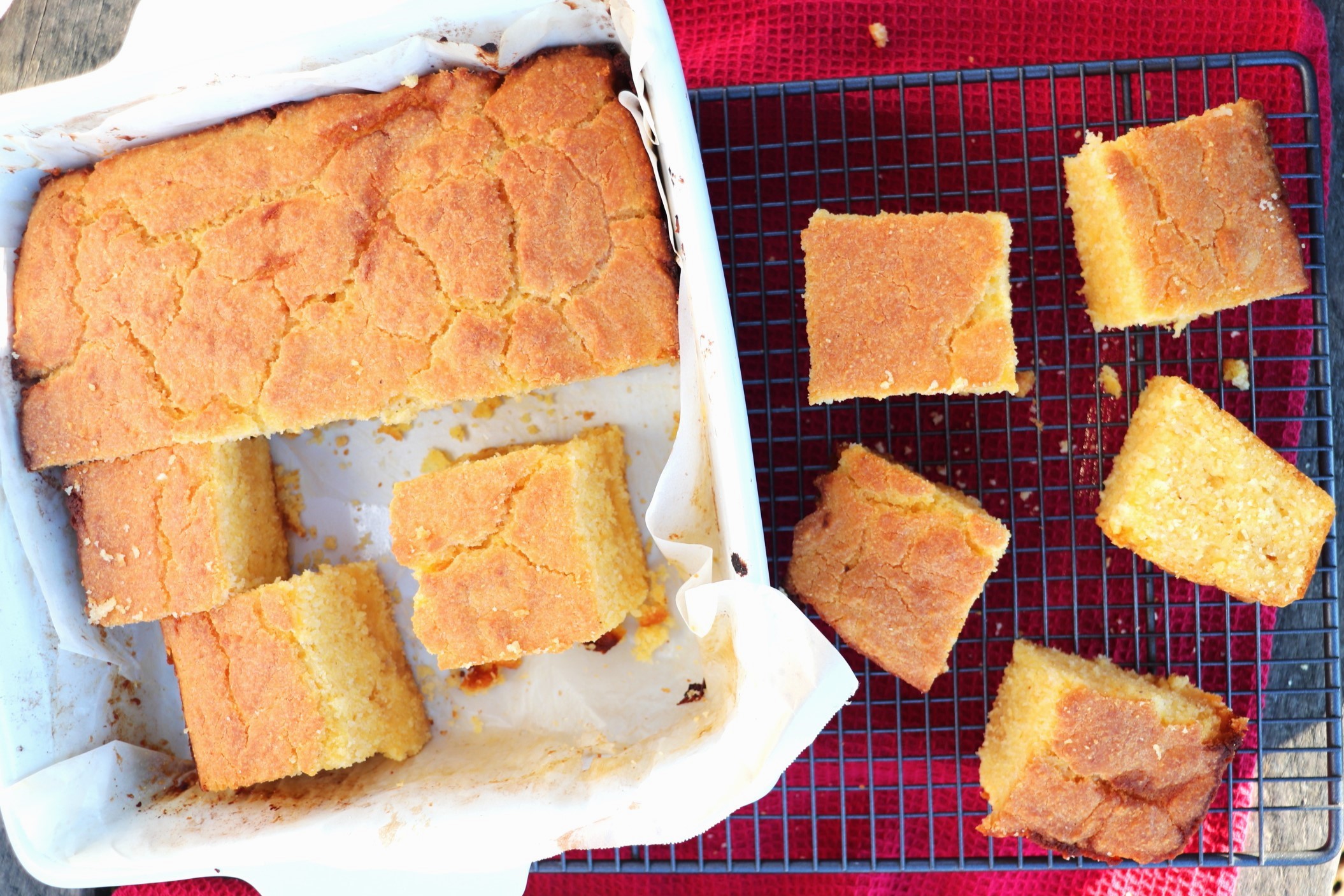 9. Remove from the oven and leave to cool slightly on a cooling rack before serving. Cut into pieces (I cut mine into about 20 pieces) and serve while still warm.