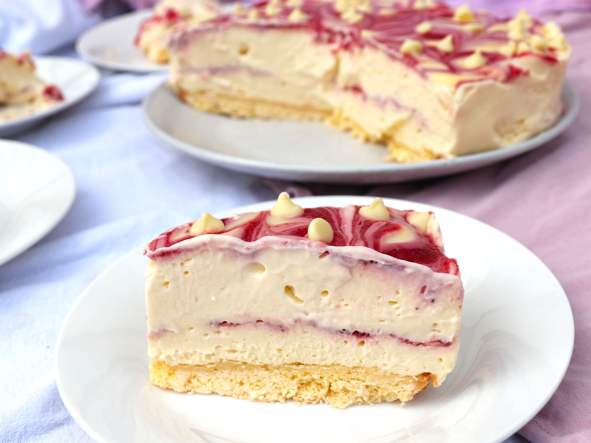 1. Ensure all the components of the cheesecake are cool and, if necessary, gently stir the strawberry sauce to incorporate any jelly-like bits that may have formed on top of the sauce.