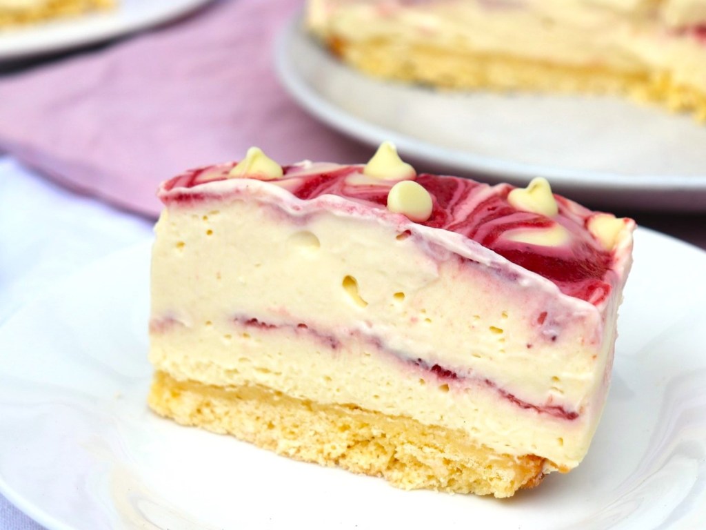 2. Spoon half the cream cheese filling on top of the biscuit base and smooth the top with a spatula or the back of a spoon. Spoon about 5 – 6 tablespoons of strawberry sauce into rows across the top of the cream cheese filling in the pan, leaving a gap between each row. Drizzle about half of the chocolate ganache into rows above the strawberry sauce, angling the rows in a different direction to the one used for the strawberry sauce and again leaving a gap between each row. Use a butter knife or the end of a spoon to swirl together the cream cheese filling, strawberry sauce and chocolate ganache into a marble pattern, being careful not to dig the knife or spoon too deep as that may break the base.
