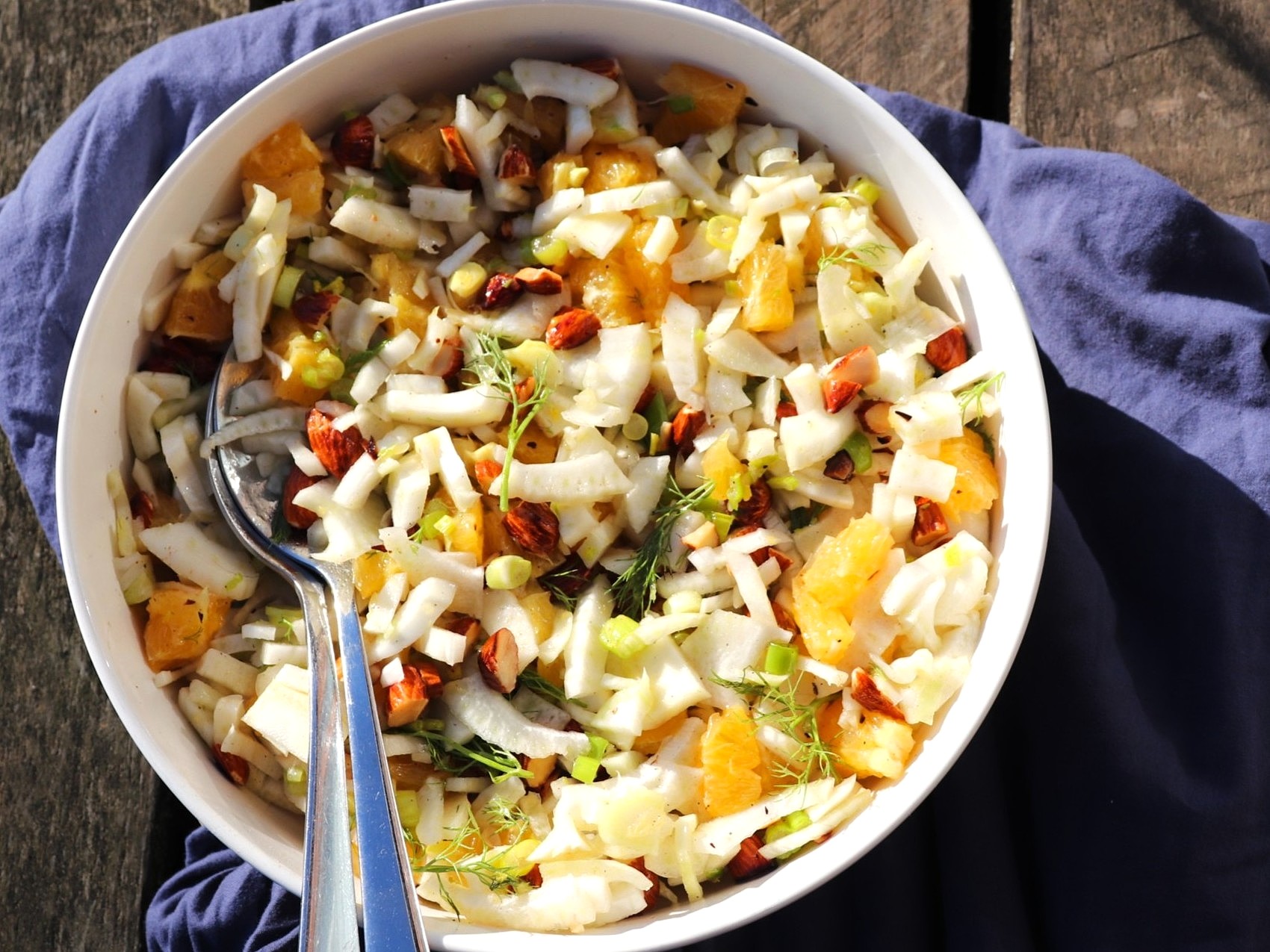 5. Place the sliced fennel, orange pieces, spring onion slices and toasted almonds all together in a bowl.